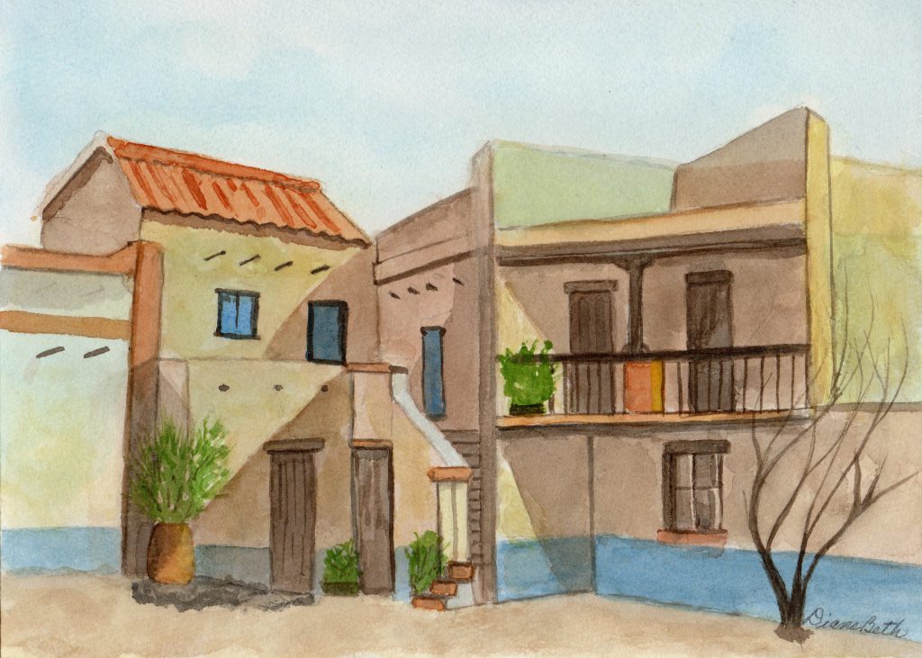 The Mexican House was so much fun to paint! Paul Clark provided the sketch and a demo as he painted the Mexican House. I was attracted to this tutorial because of the bright light and with lots of color and character. It was a wet-on-wet with lots of washes which means lots of water and lots of drying time. So, while this one was drying, I would paint some details on a butterfly. Then I’d go back to the Mexican House. I found this a very good way to maximize the fun of painting and minimize the waiting time between washes.